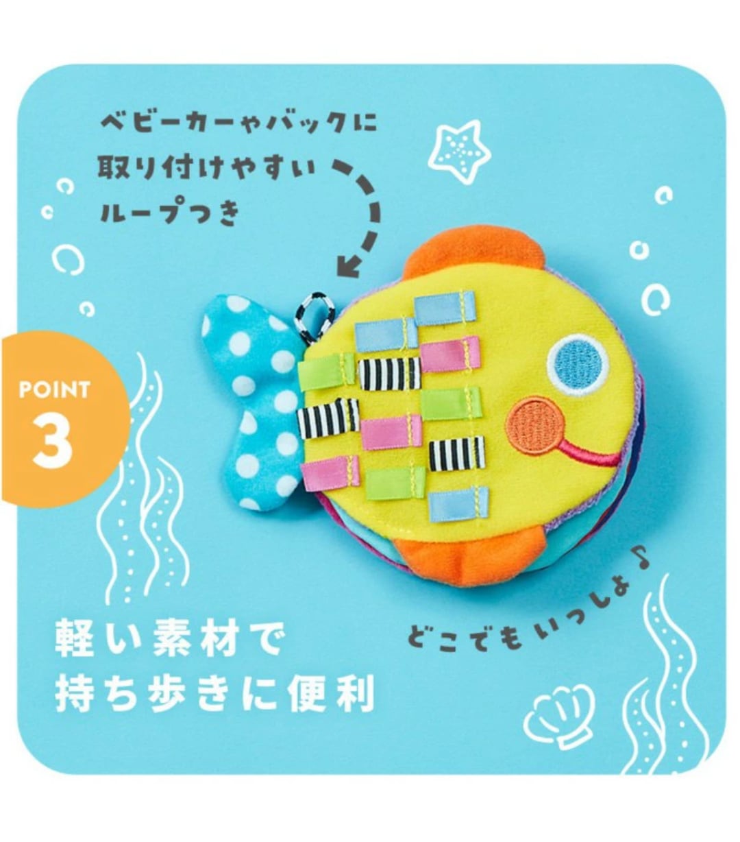 【おさかな】好奇心にであおう 触ろう ベビーカーにも取り付けやすいループ付き。にっこりえがおのおさかなさん ぴろぴろうろこさわってみて。