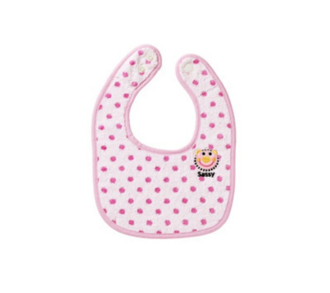 Sassyの人気キャラクターがモチーフとなった、ふんわり柔らかなタオルビブ。2段階のスナップボタンで首周りが調節可能。