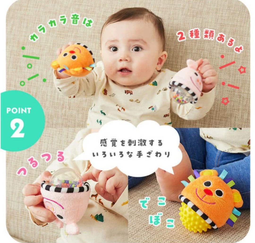 知育ポイント୨୧ 赤ちゃんは音を聴いて身の回りを認識していきます。2種類のビーズのカラカラ音を片耳ずつ聴かせてあげてみよう♪