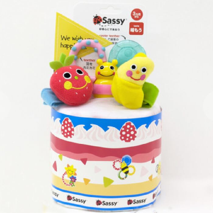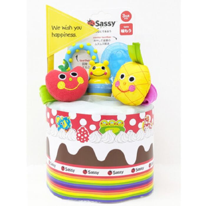 人気のおもちゃがついたカラフルなSassyのおむつケーキ。Sassyのロングセラーのカラフルなハチの歯がため『カミカミみつばち』と人気商品のにこにこリストラトルセット。はっきりとした色使い、いろいろな手触りや仕掛けが、赤ちゃんの興味を引きつけます。